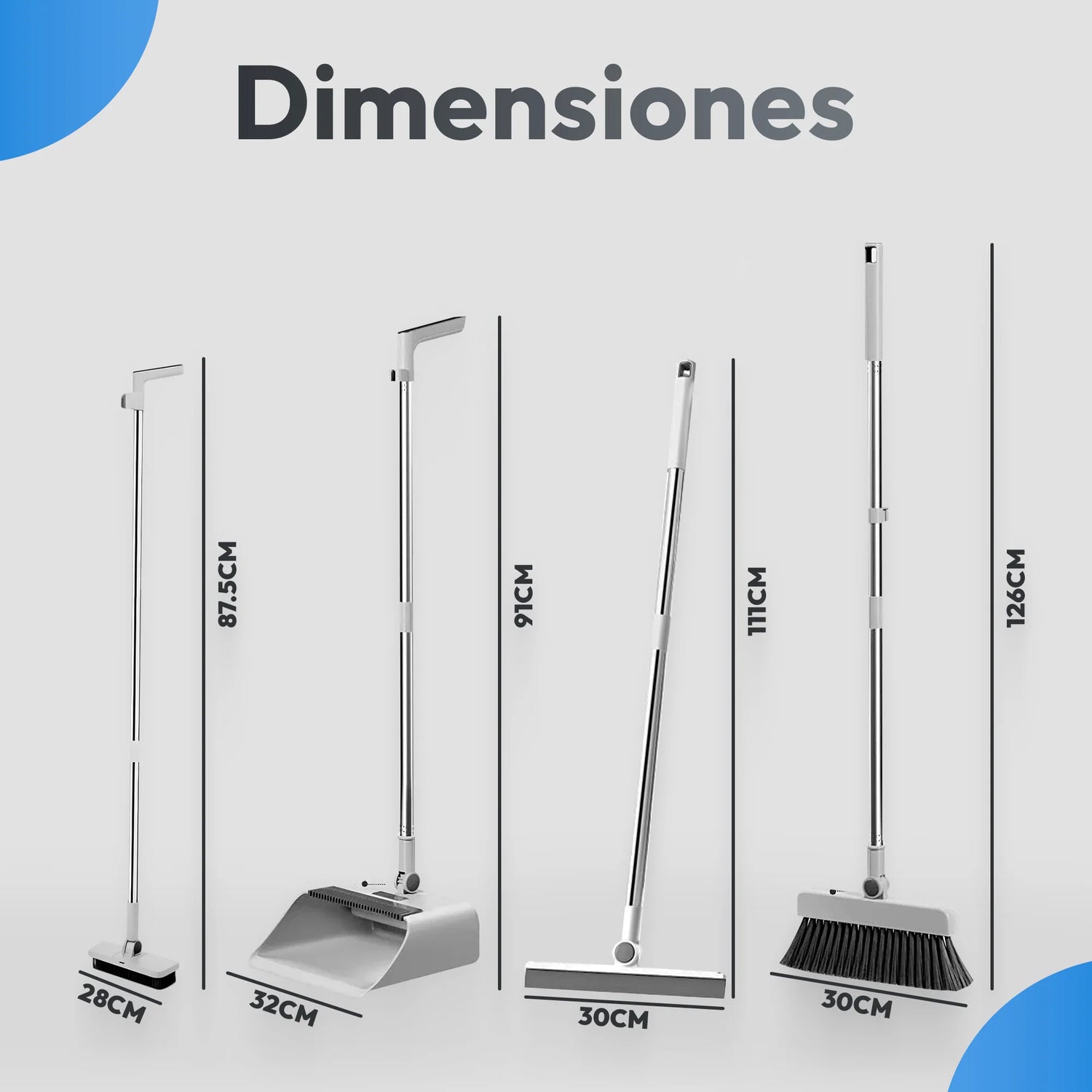 Incluye una escoba grande, un cepillo pequeño para suciedad difícil y un recogedor con peine integrado. ¡El kit perfecto para mantener tu hogar impecable!