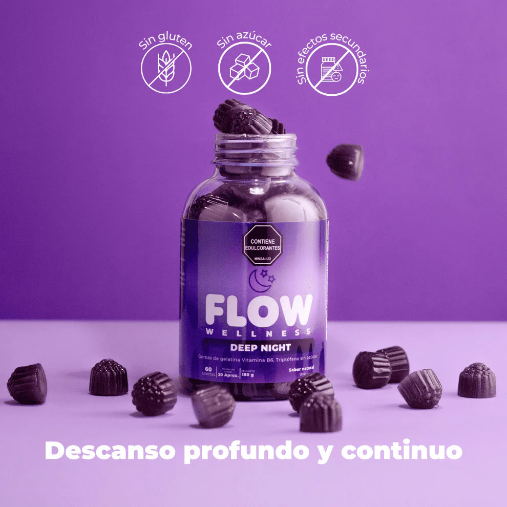 Deep Night es un suplemento natural en forma de gomitas sabor uva, formulado con triptófano y vitamina B6 para ayudarte a conciliar el sueño, dormir profundamente y despertar sin somnolencia. Regula tus ciclos naturales de sueño sin generar dependencia.
