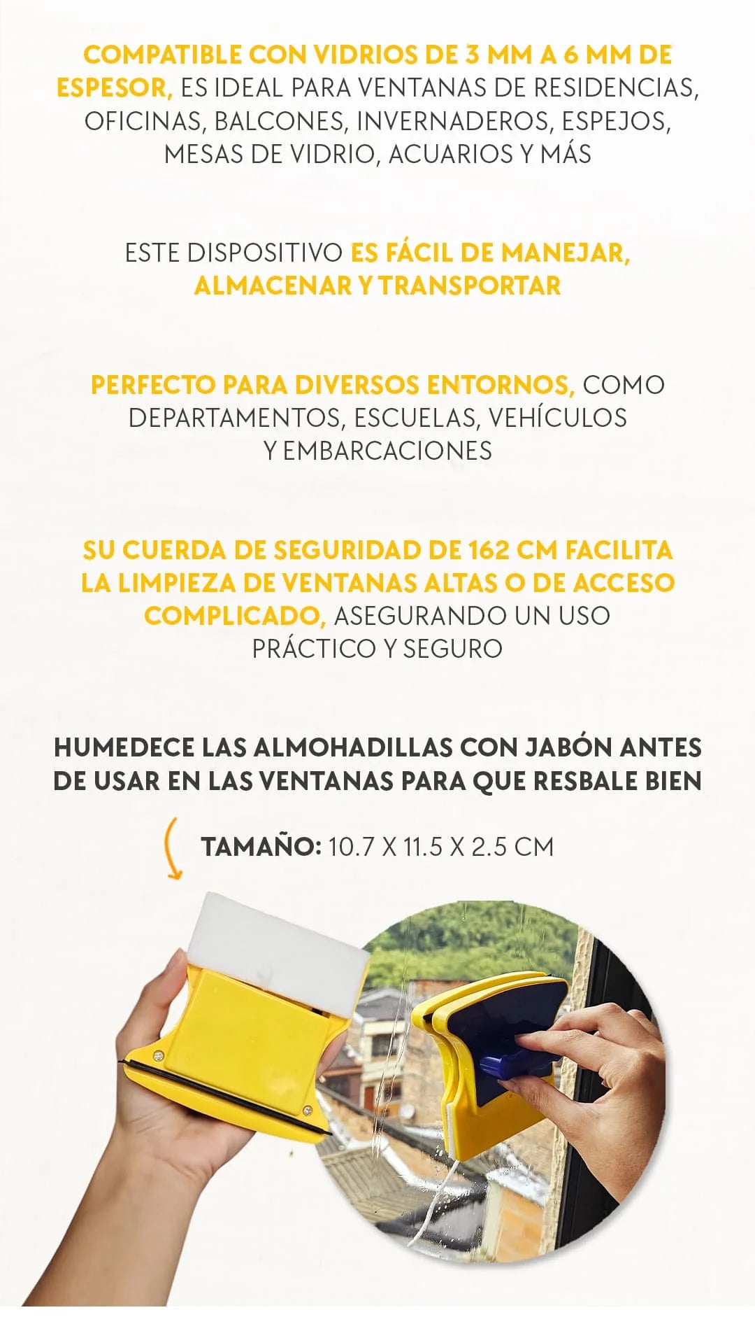 - Ideal para limpiar ventanas exteriores desde el interior de tu hogar, eliminando riesgos innecesarios.