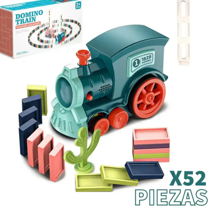 El kit incluye el tren, bloques de dominós de colores y un cargador para facilitar su uso.