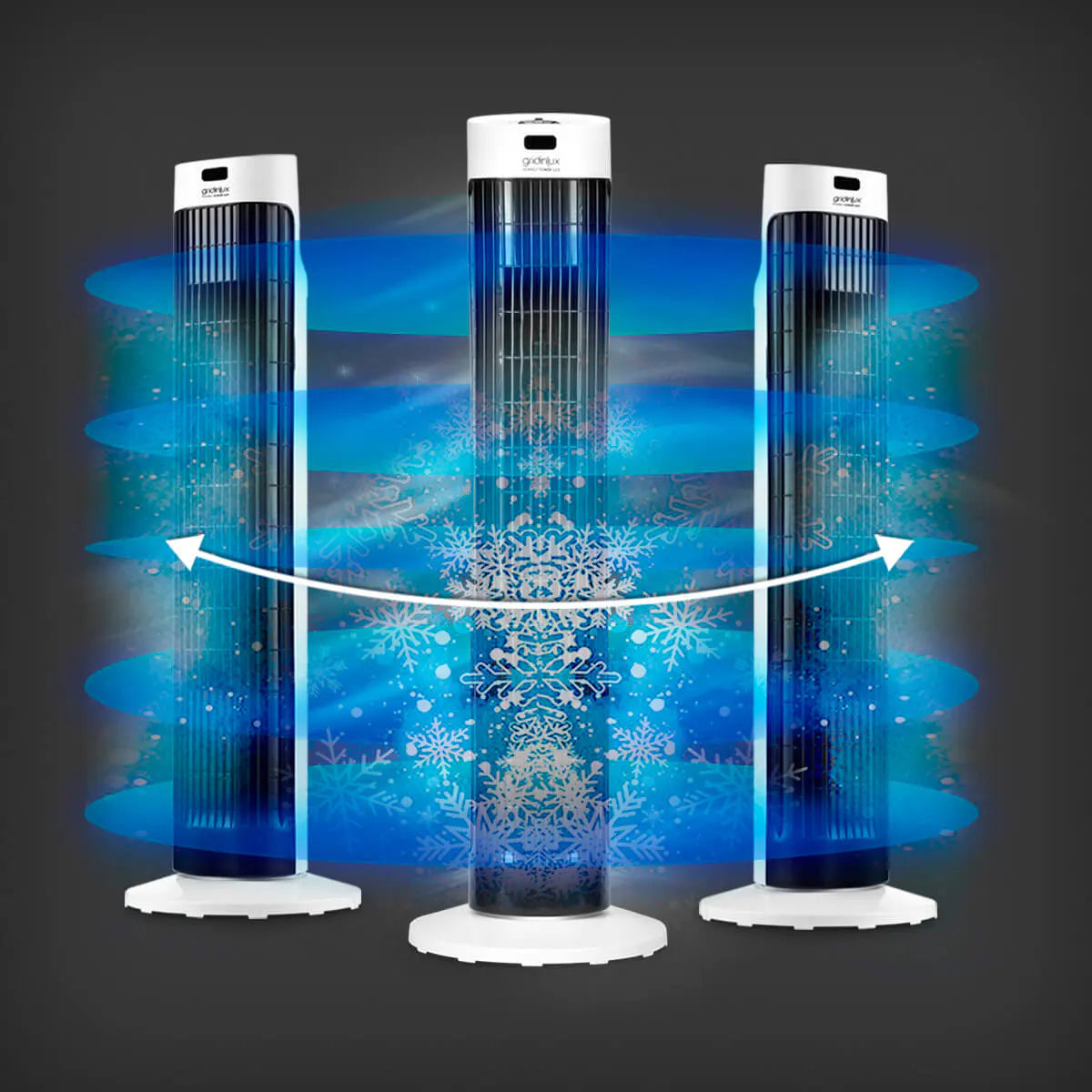 TurboCool™ es una torre de ventilación potente, silenciosa y de bajo consumo, diseñada para refrescar tu hogar de forma eficiente. Su motor de 45 W, combinado con 3 niveles de potencia y 3 modos de funcionamiento, genera una ráfaga de aire personalizada que se distribuye por toda la habitación gracias a su función oscilante.